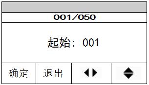 打印之前您需要設置需打印數據的起始序號和結束序號,使用“”鍵在序號的各位之間切換,使用“”鍵改變各位的數字大小,設置完成后按“確定”鍵確認。