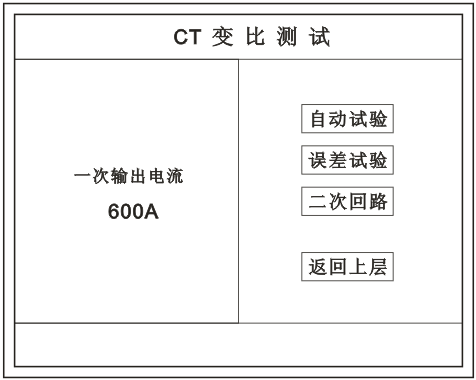 在主菜單界面,旋轉(zhuǎn)鼠標將光標移動到 CT測試 選項上,按下旋轉(zhuǎn)鼠標選擇 CT變比 即可進入變比極性試驗設置界面(如下圖)。光標移動至 返回上層 ,按下鼠標即可返回主菜單。