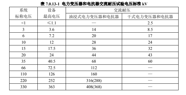 2.容量為 8000kVA 及以上、繞組額定電壓在 110kV 以下的變壓器,在有試驗(yàn)設(shè)備時(shí),可按表 7.0.13-1 試驗(yàn)電壓標(biāo)準(zhǔn),進(jìn)行線端交流耐壓試驗(yàn);